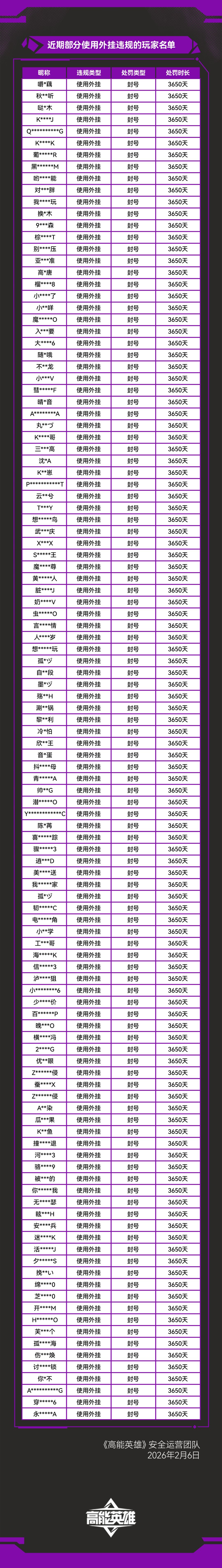 《高能英雄》外挂作弊处罚公告(2月6日)