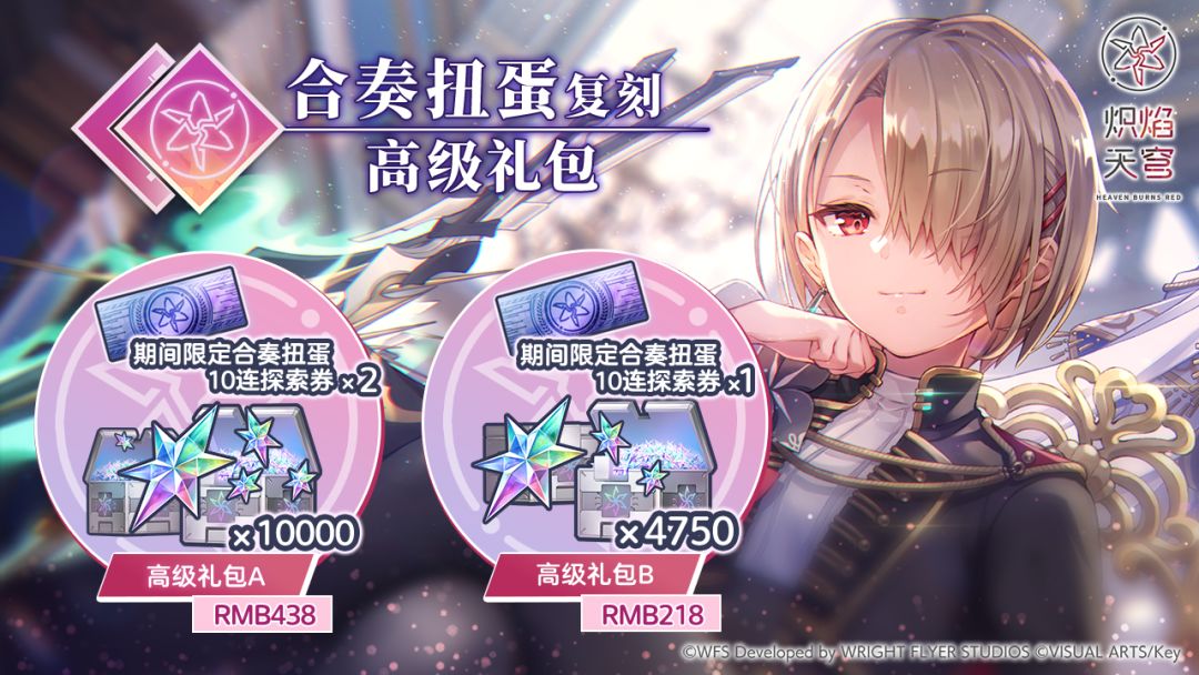 ●礼包A内容为「付费晶石×10000」、「期间限定合奏扭蛋10连探索券×2」,可购买2次;礼包B内容为「付费晶石×4750」、「期间限定合奏扭蛋10连探索券×1」,可购买1次,详情可点击图片查看。