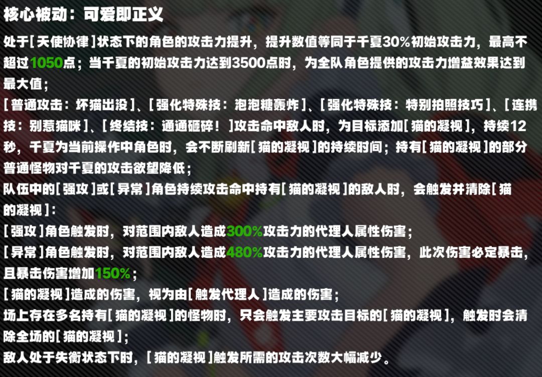 ②当千夏位于前场时,【猫的凝视】标记会不断刷新持续时间,且被标记目标对千夏的攻击欲望会降低。