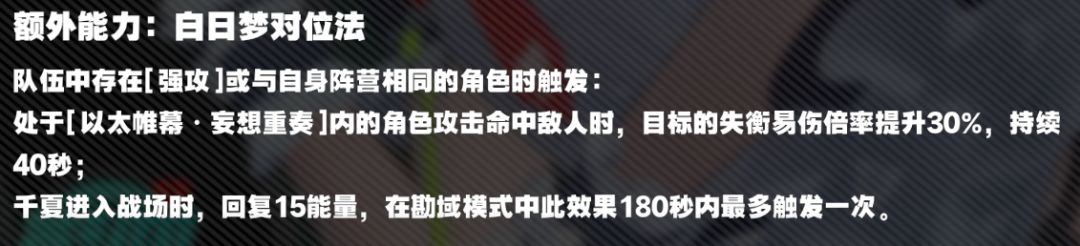 ——支援也有失衡易伤。千夏的【额外能力】可以使在[以太帷幕]内的角色攻击敌人后,提升该敌人的失衡易伤倍率。