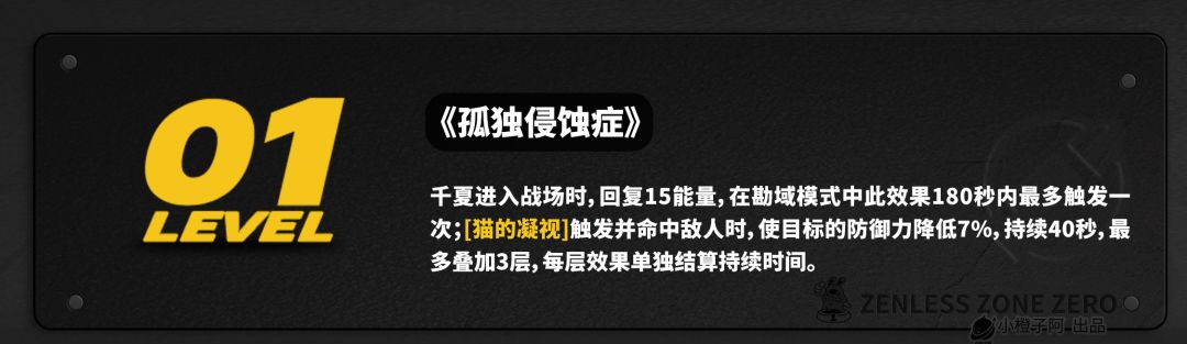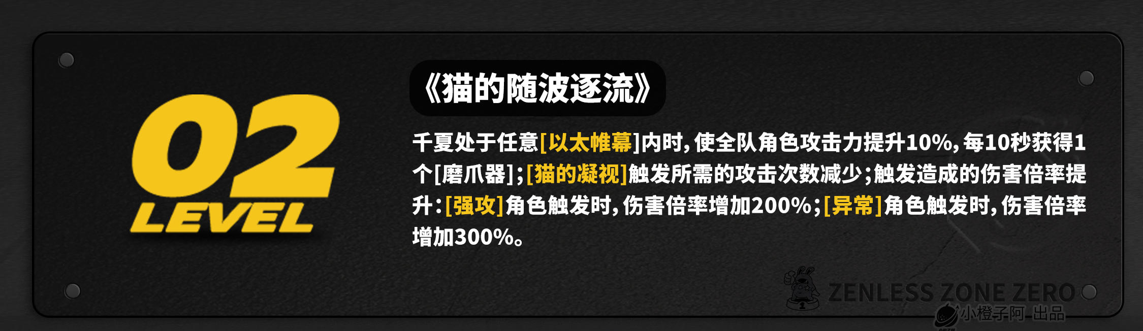 ③当队伍中的【强攻】或【异常】代理人持续攻击命中持有【猫的凝视】标记的敌人时,会触发独立附伤并清除标记。