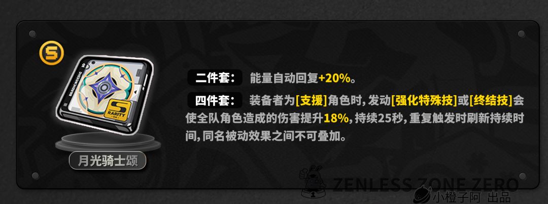 ① 四件套推荐驱动盘【月光骑士颂】,2件提供能量加成,4件发动[强化特殊技]或[终结技]全队增伤,契合千夏靠[强化特殊技]启动增益的机制。