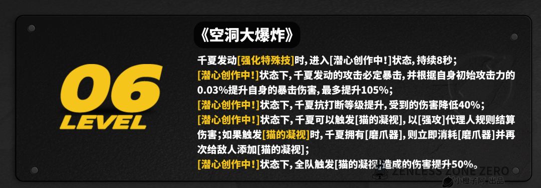 ① 千夏的核心增幅手段,可以通过[普通攻击:坏猫出没]、[强化特殊技]、[连携技]、[终结技]命中敌人后添加【猫的凝视】标记,标记持续12s。