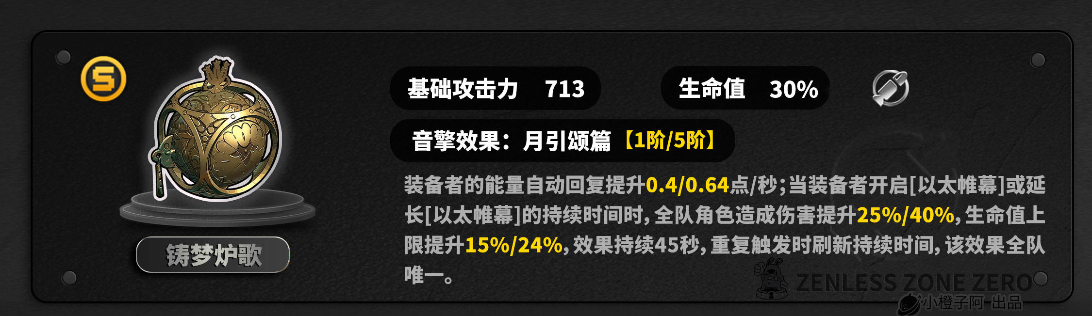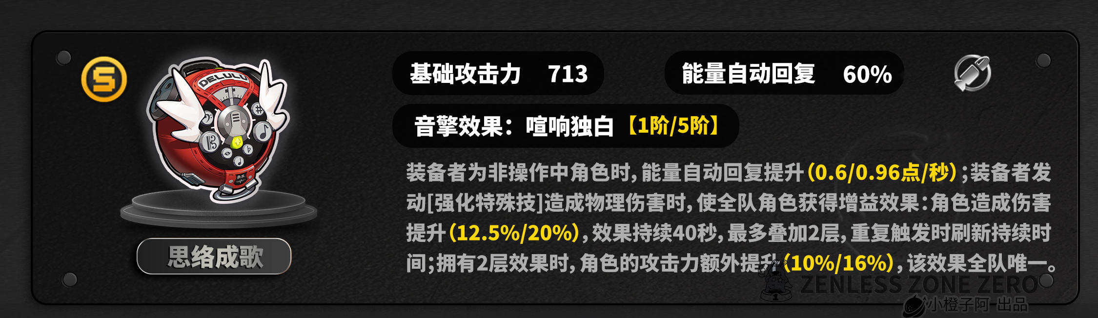 ①此音擎只有594点初始攻击力加成,初始攻击力太低了,千夏搭配【月光骑士颂】+【静听嘉音】,4、5号驱动盘选择攻击力主词条,6号位选择回能,副词条则还需要15条大攻击与1条小攻击。