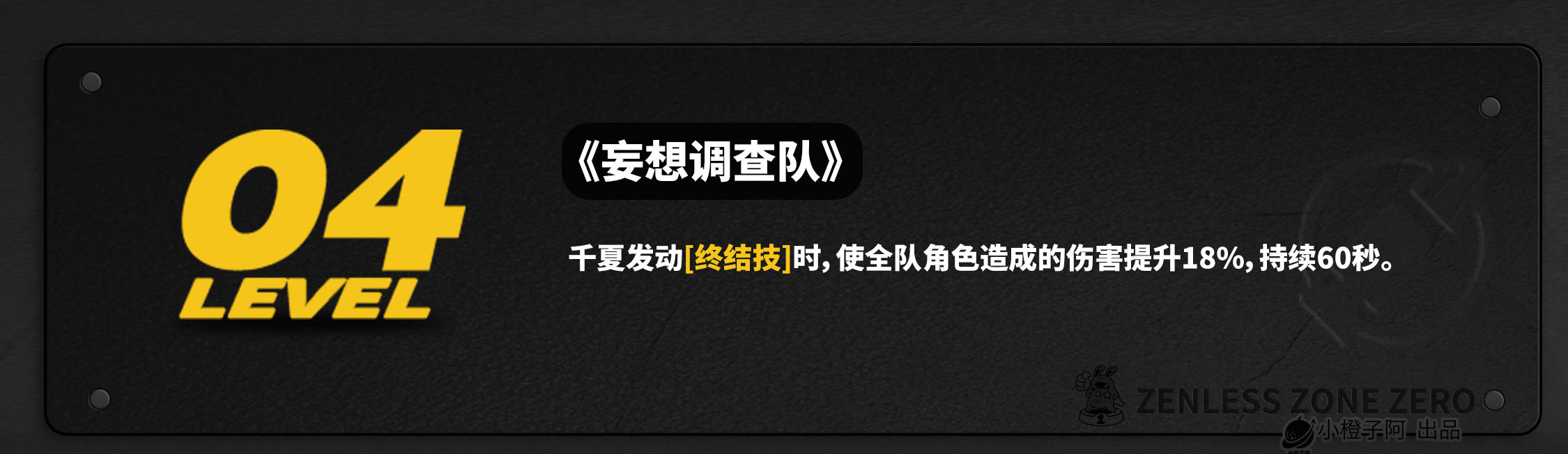 ——独立附伤。千夏可以根据队友的所有属性造成额外附加伤害,如果是异常角色,附加伤害必定暴击。
