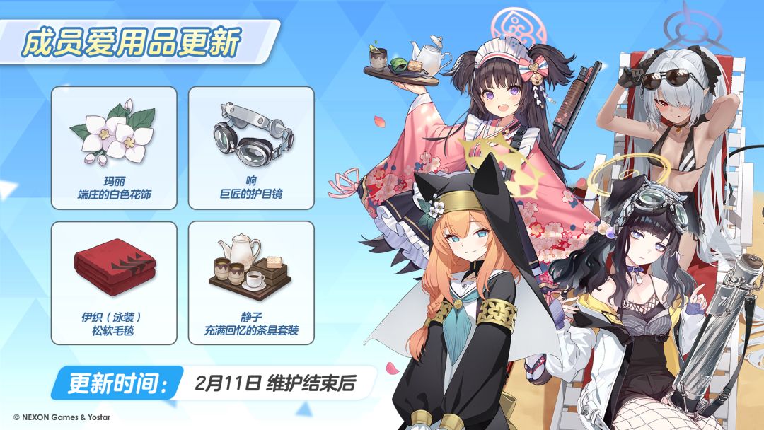02月11日版本更新后,将新增成员“伊织(泳装)”、“响”、“静子”、“玛丽”的爱用品,通过爱用品可以使对应成员获得属性增加、基础技能提升等加成各种效果,同时还将解锁全新的成员专属好感剧情。