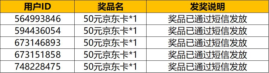 恭喜以下5位玩家在本次 “《归墟战纪》PV曝光,参与话题赢京东卡“里中奖,相关奖品已通过短信的方式发放,还请收到奖品后第一时间兑换使用!