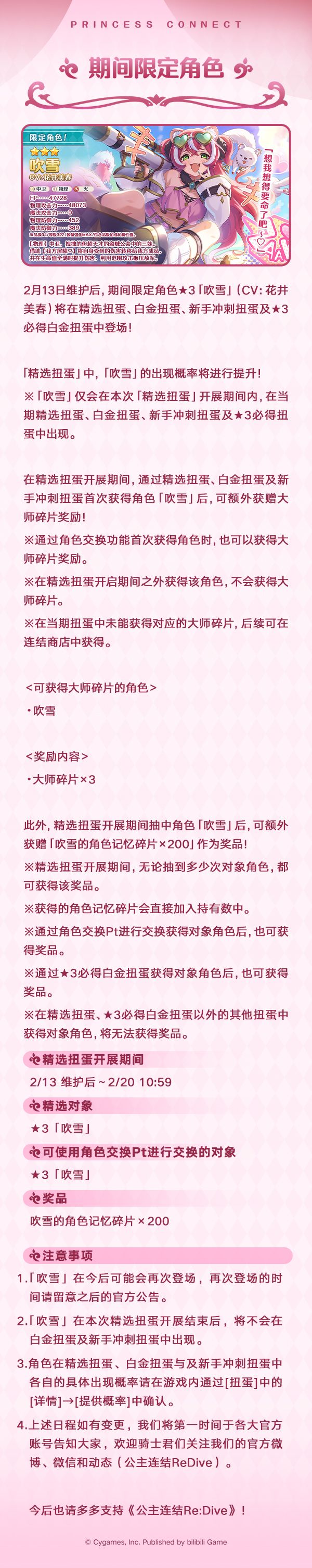 维护结束后,期间限定角色★3「吹雪」(CV:花井美春)即将登场!游戏内将同时开启「吹雪」精选扭蛋;公会之家将限时复刻「咖啡厅」主题家具;回忆留声机将追加新的背景音乐;大师商店将上架新的商品道具,并追加新的游戏内容!