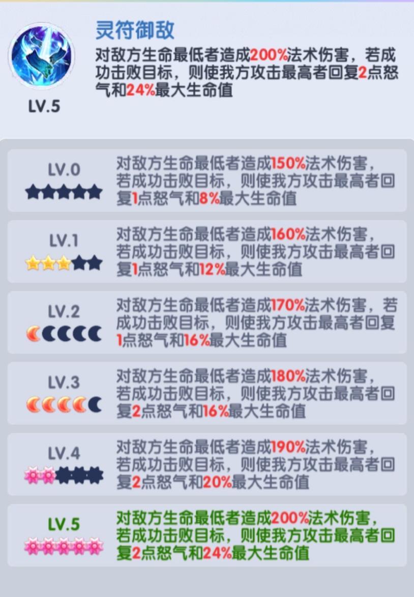 天师符的技能核心为攻击敌方生命最低的武将,若成功击杀目标,可触发额外回血回怒效果。该器灵为紫色品质,养成无资源压力,有碎片即可直接升星。上阵站位无需刻意规划,在所有核心器灵摆放完毕后,选择剩余空位摆放即可,其击杀效果的触发存在一定随机性,无需优先规划站位。