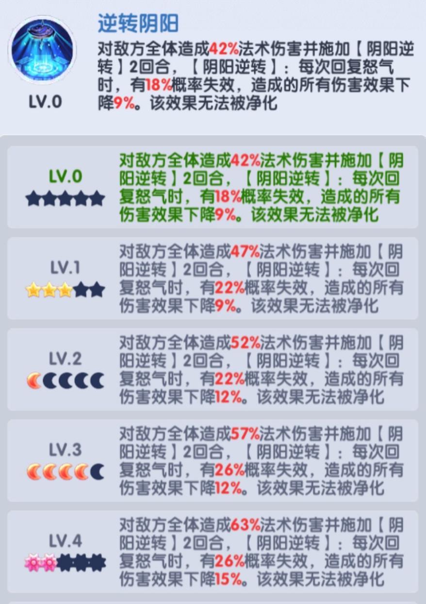 阴阳伞同为怒气相关器灵,依托怒气效果在实战中的核心作用,其升星优先级仅次于乾坤图,位列第二;该器灵的唯一短板为技能触发概率较低,升星建议至少升至 4 月亮,提升技能触发率与效果强度。实战中,阴阳伞不仅能降低敌方所有伤害,还可让敌方的怒气回复概率失效,满星状态下能让对手丢失整场战斗约 1/3 的怒气量,实际数值可能更高 —— 丢失的怒气会形成滚雪球效应,直接影响敌方回怒类技能的释放。