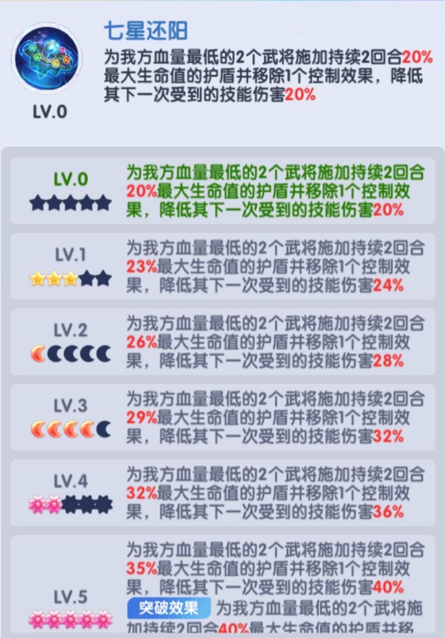上阵站位推荐放置于前排 3 或 4 号位,前期战局中该阶段大概率出现武将减员,能让七星灯的护盾与净化效果精准作用于存活武将;若在 6 名武将均在场时触发,技能目标随机性过高,实战效果会大打折扣。