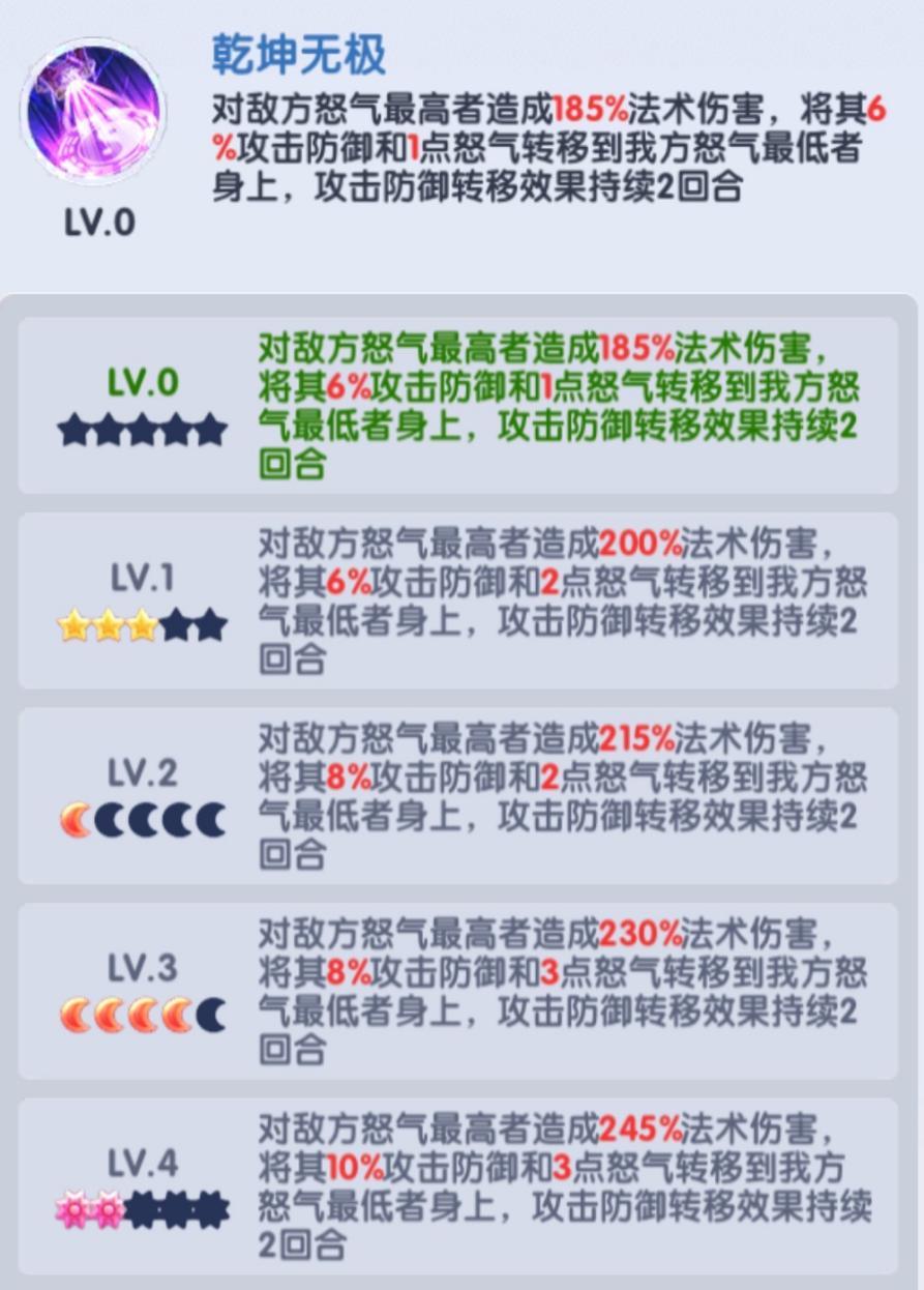 乾坤图是游戏中少数能实现大量增减怒气的器灵,而怒气相关效果在实战中起关键作用,因此该器灵的获取与升星优先级为最高。其技能核心围绕怒气改变展开,升星建议优先升至 3 星、4 月亮,条件允许可直接拉满 5 太阳,以此强化怒气压制效果 —— 敌方武将怒气被减后,将难以释放大招,新服前期针对陆逊这类依赖大招的武将时,实战效果尤为显著。