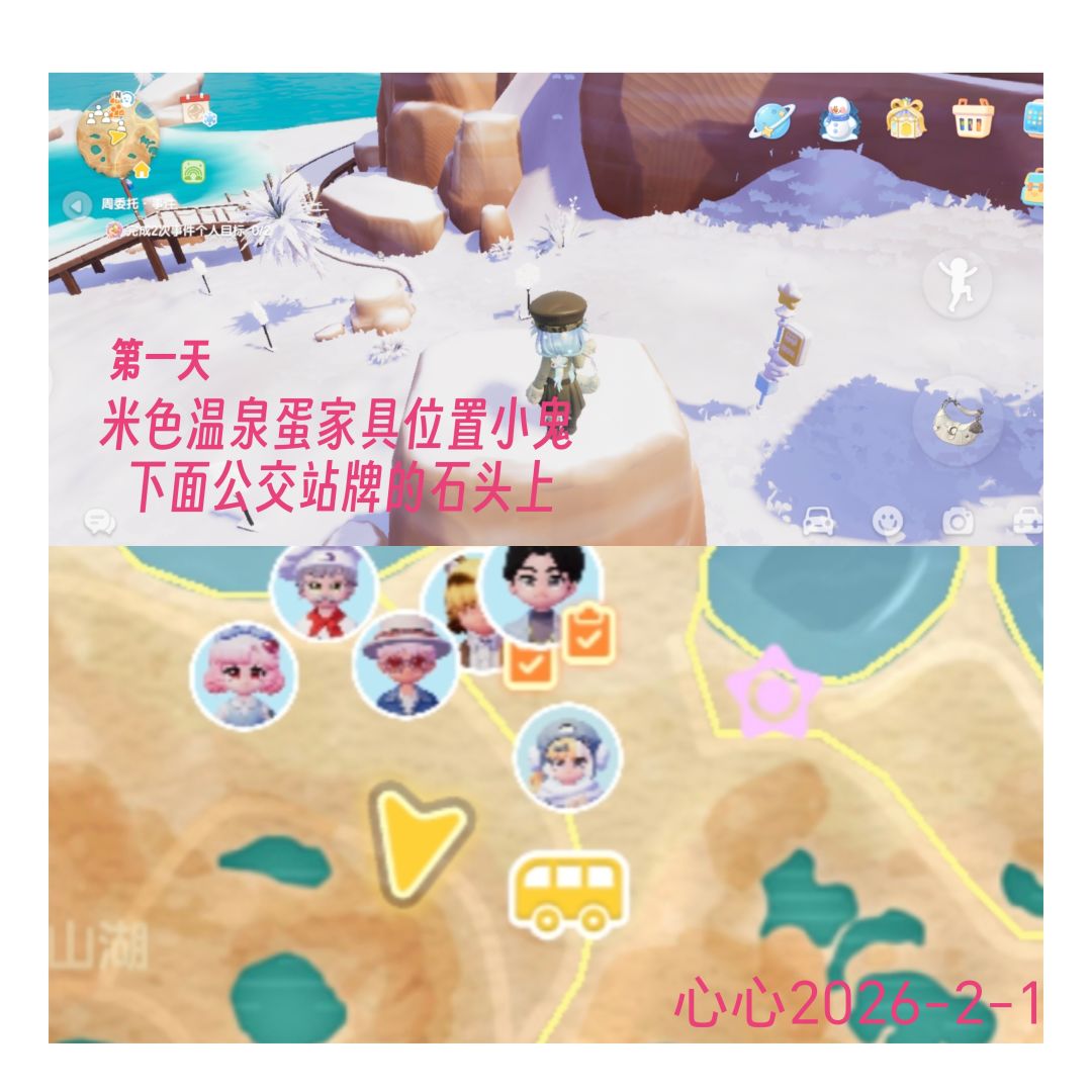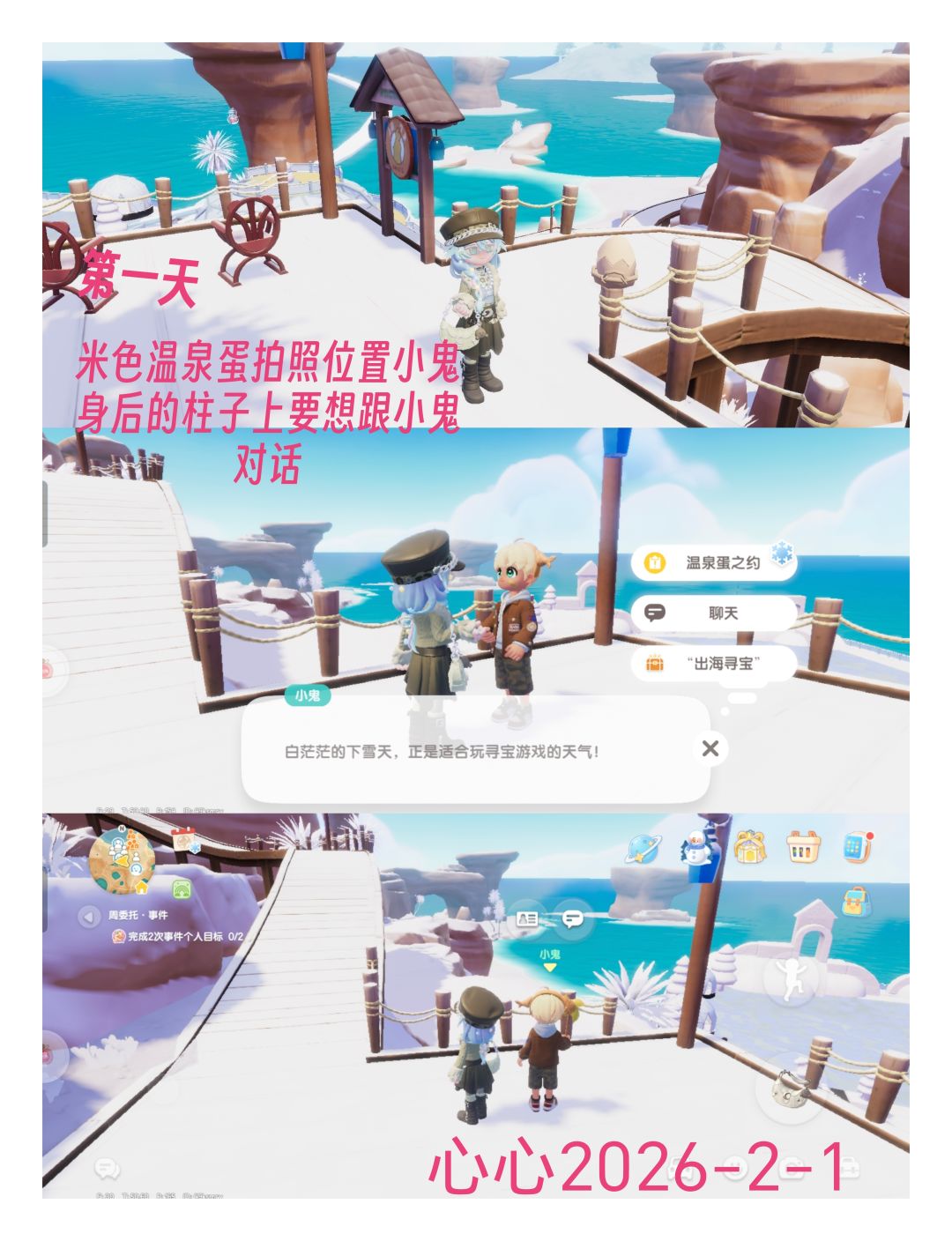 第1️⃣天米色温泉山拍照位置:找去温泉山活动地点公交站牌旁边的桥上找到小鬼npc与他对话解锁任务,米色温泉蛋在小鬼旁边的柱子上 (图7)