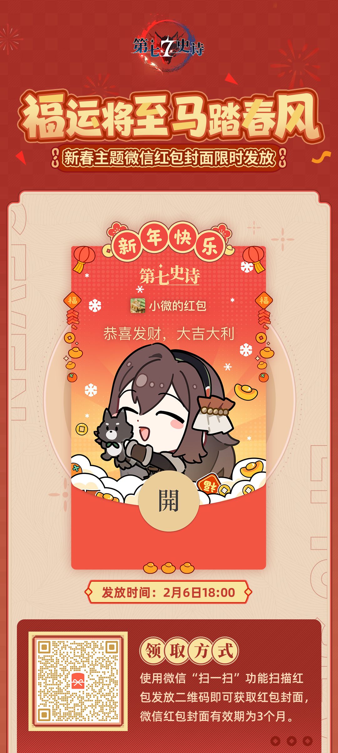于2026年2月6日18:00开始,扫描图片内二维码,或点击【领取第七史诗红包封面】即可领取,限数量有限,先到先得,送完即止哦~