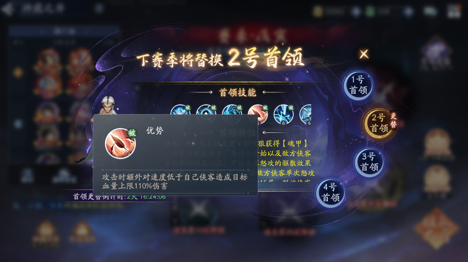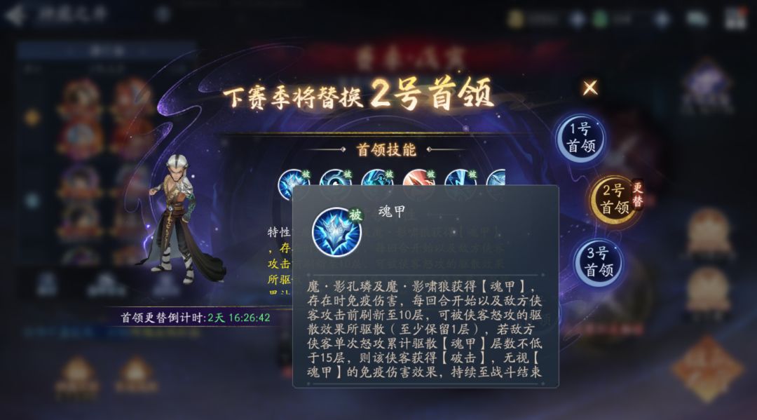 魔・影孔璘及魔・影啸狼获得【魂甲】,存在时免疫伤害,每回合开始以及敌方侠客攻击前刷新至 10 层,可被侠客怒攻的驱散效果所驱散(至少保留 1 层),若敌方侠客单次怒攻累计驱散【魂甲】层数不低于 15 层,则该侠客获得【破击】,无视【魂甲】的免疫伤害效果,持续至战斗结束