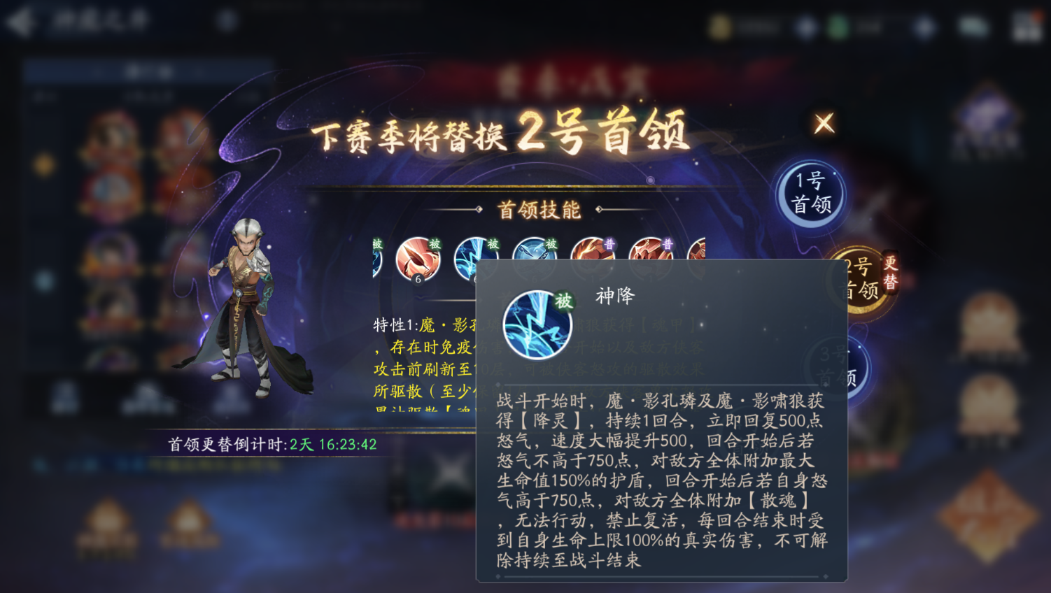 战斗开始时,魔・影孔璘及魔・影啸狼获得【降灵】,持续 1 回合,立即回复 500 点怒气,速度大幅提升 500,回合开始后若怒气不高于 750 点,对敌方全体附加最大生命值 150% 的护盾,回合开始后若自身怒气高于 750 点,对敌方全体附加【散魂】,无法行动,禁止复活,每回合结束时受到自身生命上限 100% 的真实伤害,不可解除持续至战斗结束