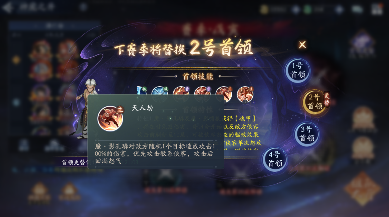 魔・影孔璘对敌方随机 1 个目标造成攻击 100% 的伤害,优先攻击敏系侠客,攻击后回满怒气