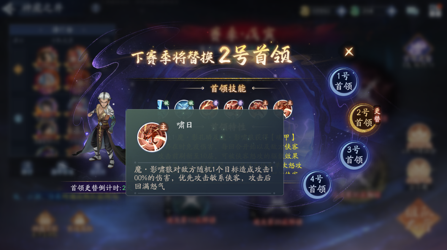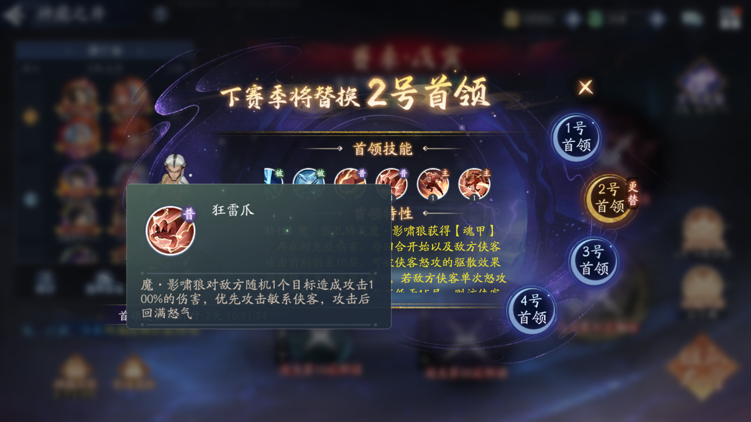 魔・影啸狼对敌方随机 1 个目标造成攻击 100% 的伤害,优先攻击敏系侠客,攻击后回满怒气