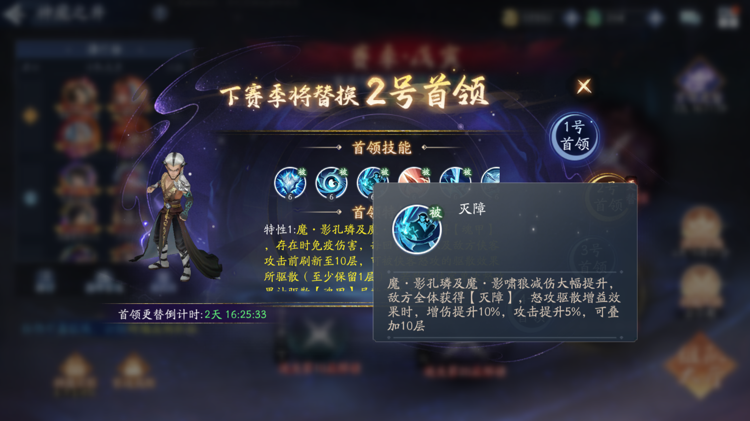 魔・影孔璘及魔・影啸狼减伤大幅提升,敌方全体获得【灭障】,怒攻驱散增益效果时,增伤提升 10%,攻击提升 5%,可叠加 10 层