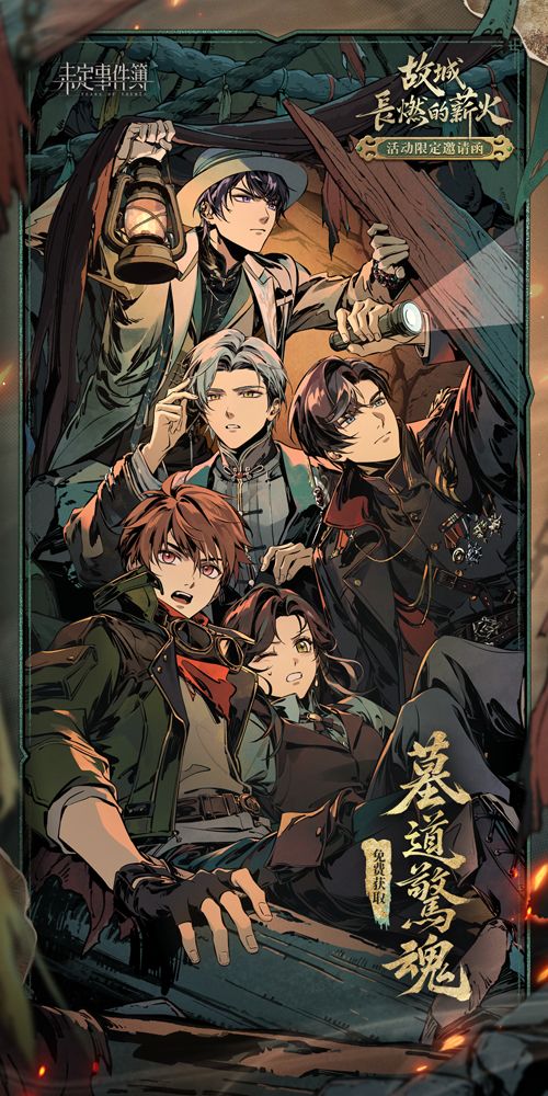 参与「故城长燃的薪火」大型新春活动,即可免费领取夏彦R思绪【凶焰】、左然R思绪【烈烽】、莫弈R思绪【燎原】、陆景和R思绪【炫火】、活动徽章【时和岁丰】及邀请函【墓道惊魂】