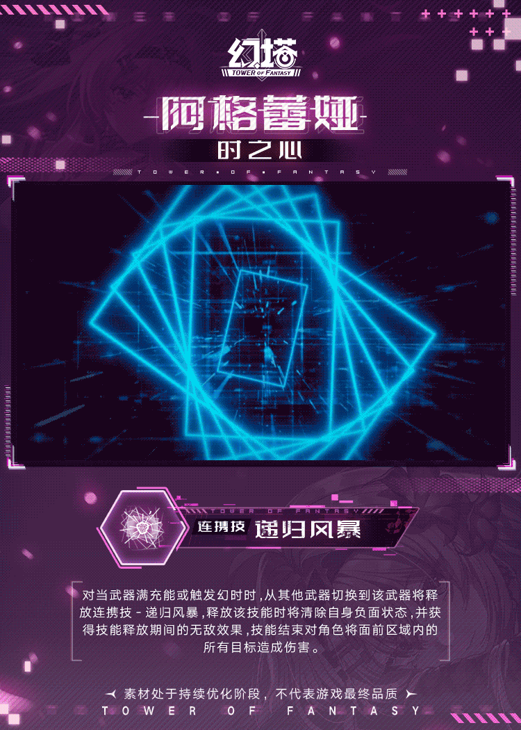 当武器满充能或触发幻时时,从其他武器切换到该武器将释放连携技-递归风暴,释放该技能时将清除自身负面状态,并获得技能释放期间的无敌效果,技能结束对角色将面前区域内的所有目标造成伤害。