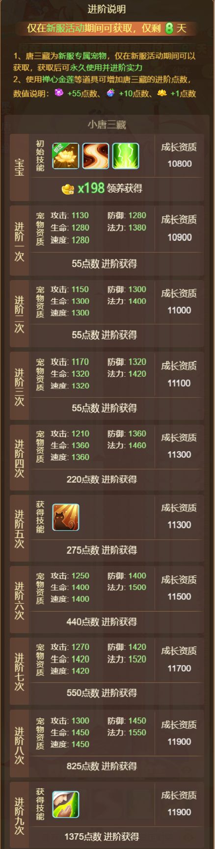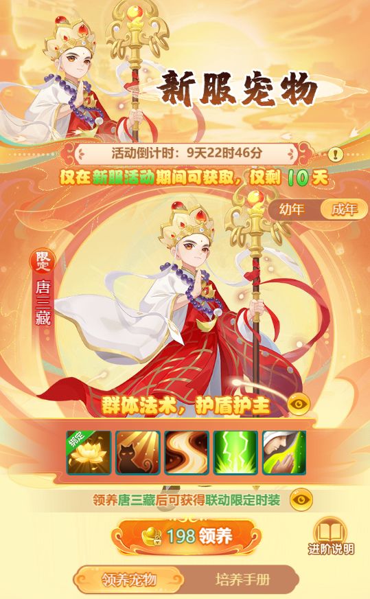 1.活动期间内可领养唐三藏,领养后可永久使用并进阶实力