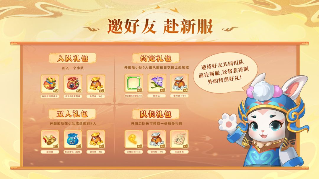 此外,与好友绑定队伍,还可层层解锁专属组队福利——从初入江湖的“同心礼”,到整装待发的“战备礼”,直至全员到齐的“约定礼”,奖励随着你们的情谊同步升级!