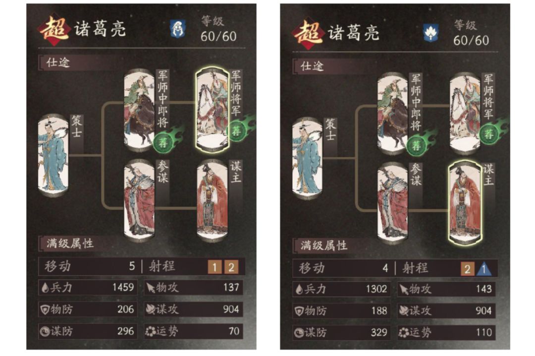 由于统帅线面板数值全方位高于策士,且统帅兵营整体提升更大,诸葛亮推荐优先走统帅路线上精通十二,后消耗龙骧之印*2获得策士线精通八技策「奇门遁甲」。与以往不同,诸葛亮后期达到高升迁后,推荐有余力前提下拉满双线精通十二,以追求人权输出角色的数值上限。