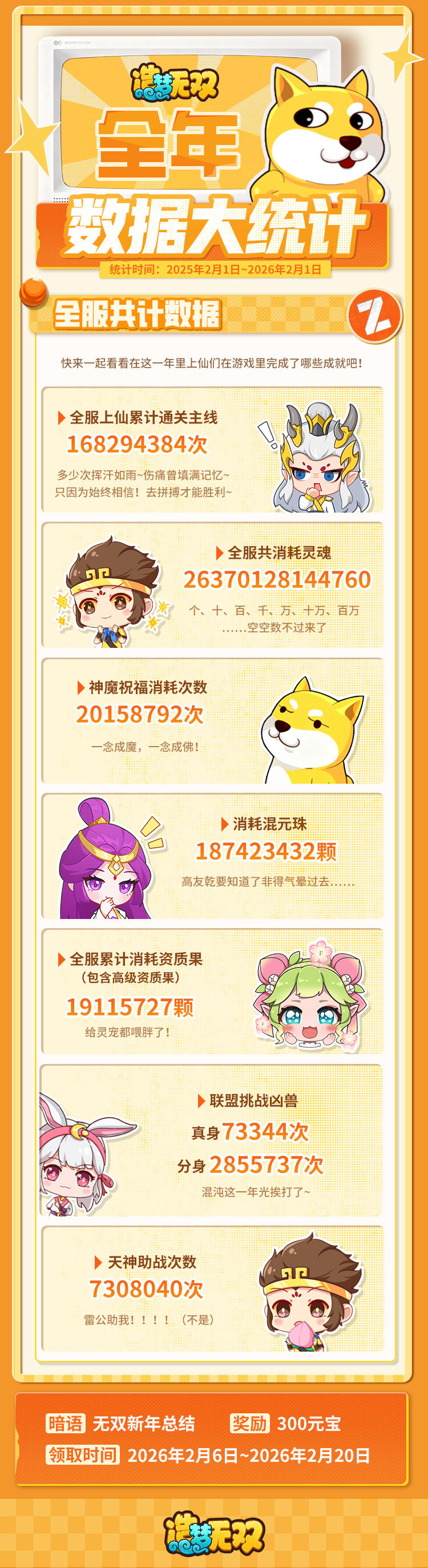 上仙,你是否也有好奇过?在无双每天有这么多上仙在三界闯荡,那么一年下来 所有的上仙总和起来,到底达成了哪些惊人的数据呢?一起来看看吧~