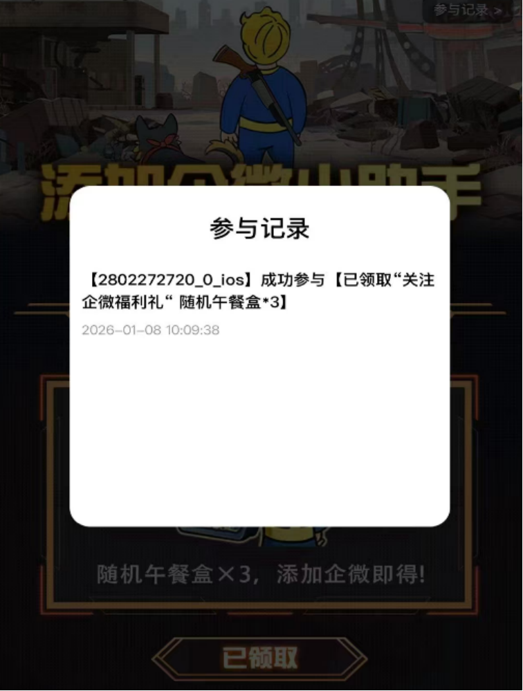 如您已经添加企微,可进入辐射乐园,前往企微好礼,点击领取,或直接点击链接:#小程序://辐射乐园/JgSQ4bSnPCP25Bl