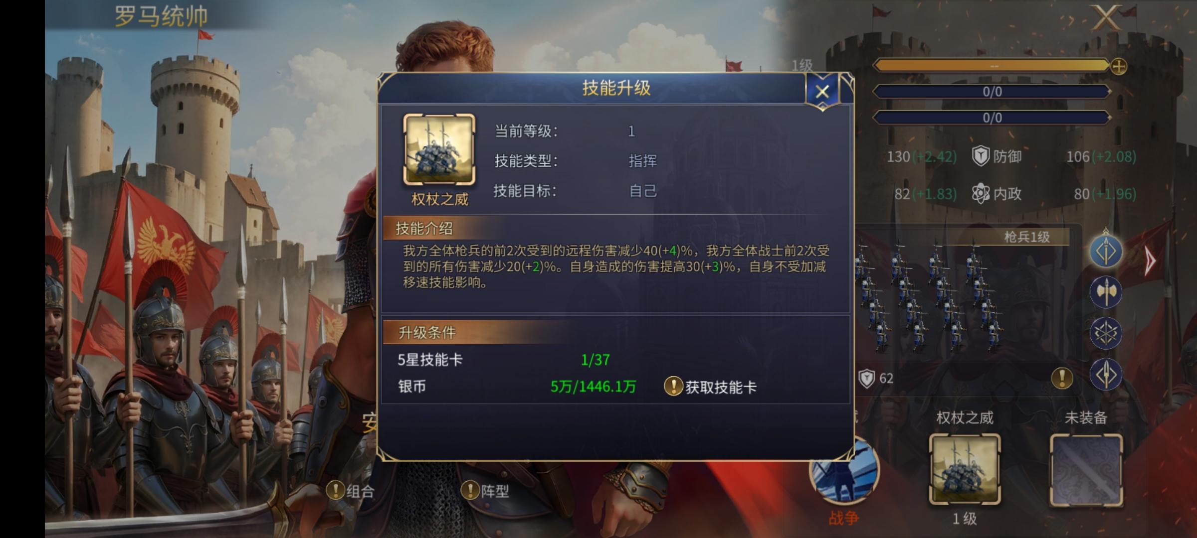罗马统帅新技能:我方全体枪兵前2次受到的远程伤害减少40(+4)%,我方全体战士前2次受到的所有伤害减少20(+2)%,自身造成的伤害提高30(+3)%,自身不受加减移速技能影响。