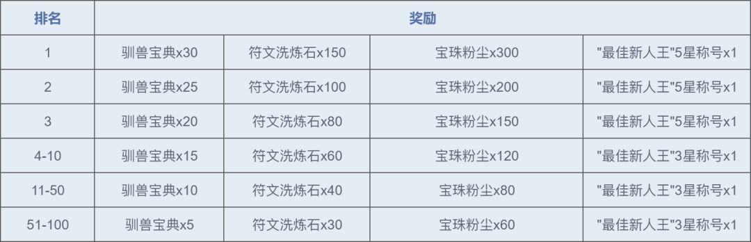 活动时间:开服第1-14天活动开启后,角色等级达到时可领取大额银币奖励,活动结束后等级排名前100名可获得驯兽宝典、符文洗炼石、宝珠粉尘、称号等奖励。