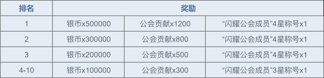 活动时间:开服第1-14天开服后,新建公会人数达到30人即可领取奖励公会贡献,活动结束后公会排名前10名的公会成员可领取“闪耀公会成员”称号。