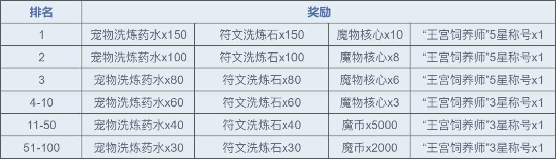 活动时间:开服第1-14天收集宠物点亮对应图鉴,可领取丰厚宠物硬币奖励和宠物洗炼药水、魔物核心等进度奖励。活动结束后前100名可获得宠物洗炼药水、符文洗炼石、魔物核心、称号排名奖励。