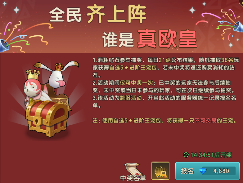 活动时间:2月16日 6:00~2月27日 11:00活动期间,通过使用钻石可参与全民抽奖,中奖玩家可获得自选5★进阶王宠包!打开后可从多个王宠中,选择一个不可交易的宠物。未中奖玩家,将返还参与抽奖所消耗的钻石。