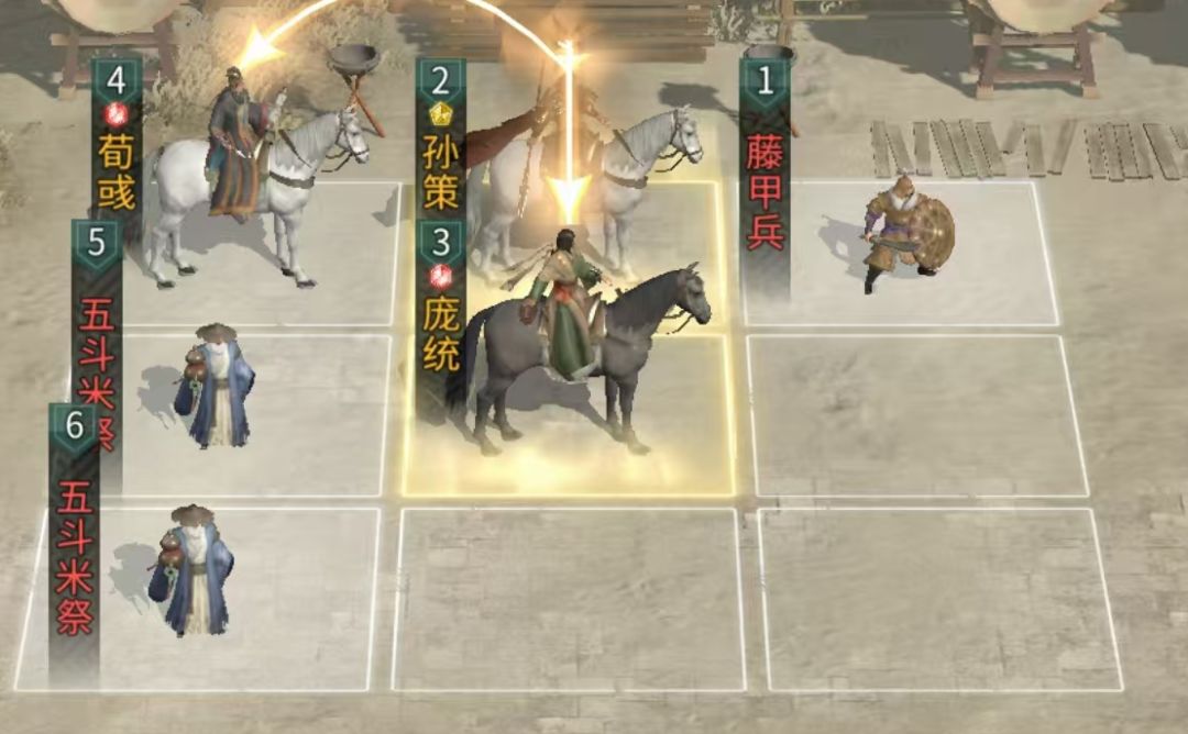 兵种站位:在荀彧的下方放置两个五斗米祭,在孙策的前方放置一个藤甲兵。
