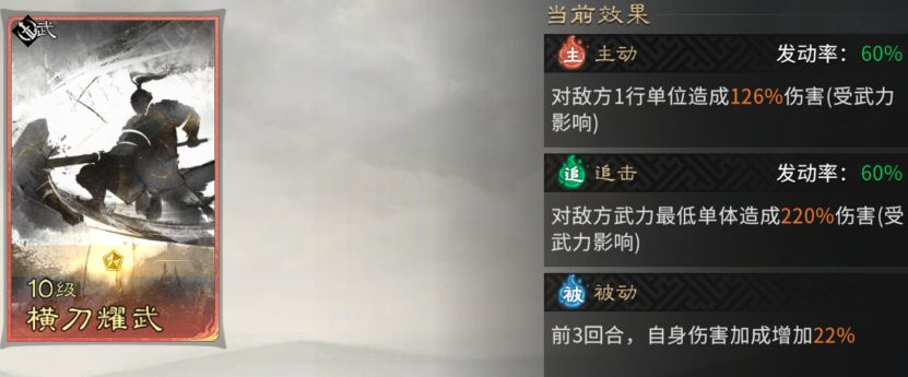 追击技能固定携带【横刀耀武】,该技能能精准锁定敌方武力较低的单位(通常是辅助位)并造成伤害,旨在通过快速清除此类关键角色,实现战术减员。