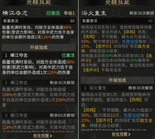 此外,庞统在阵亡时可触发觉醒技【浴火重生】,复活并恢复一定兵力。复活后,其智力获得提升,并立即再次施放【连环计】,将【连环】状态扩散至敌方全体。即使倒下,亦能持续发挥强大的战术干扰与威慑作用。