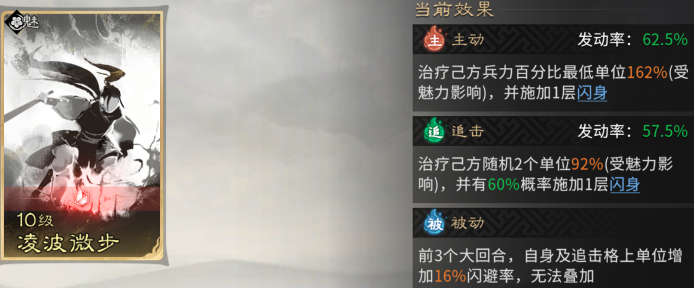 主动技能固定携带【凌波微步】,为己方当前兵力较低的单位同时提供治疗,并施加一次闪身,有效防止其被快速击倒,从而增强队伍整体的续航与生存能力。