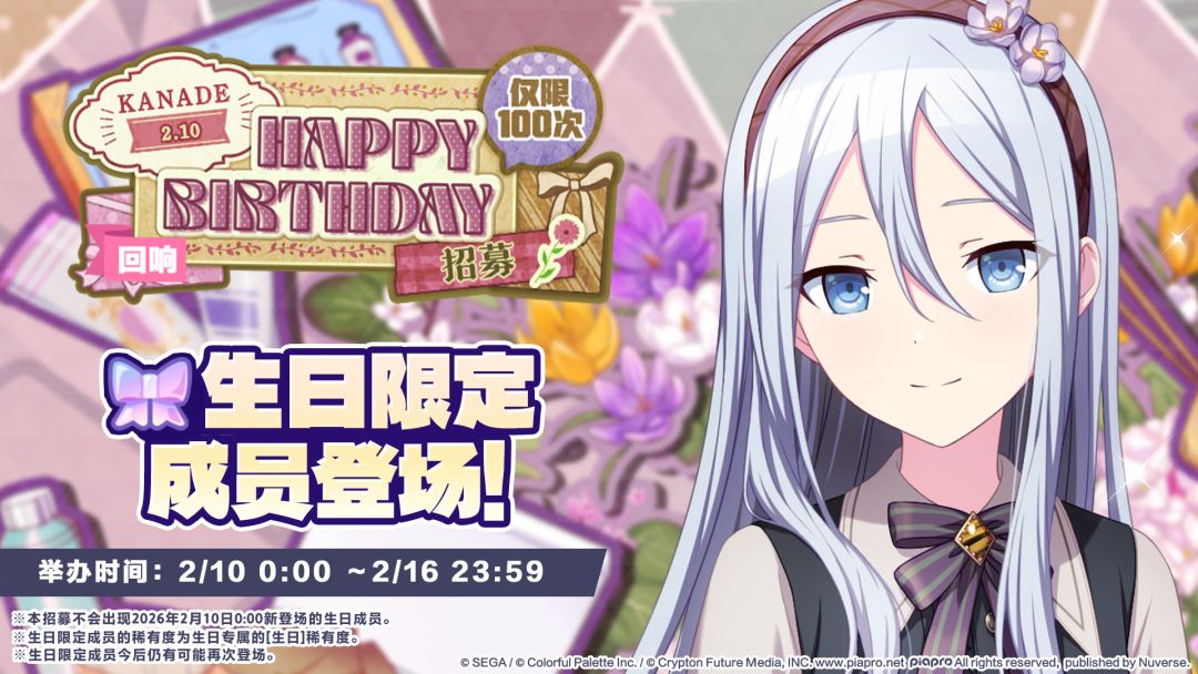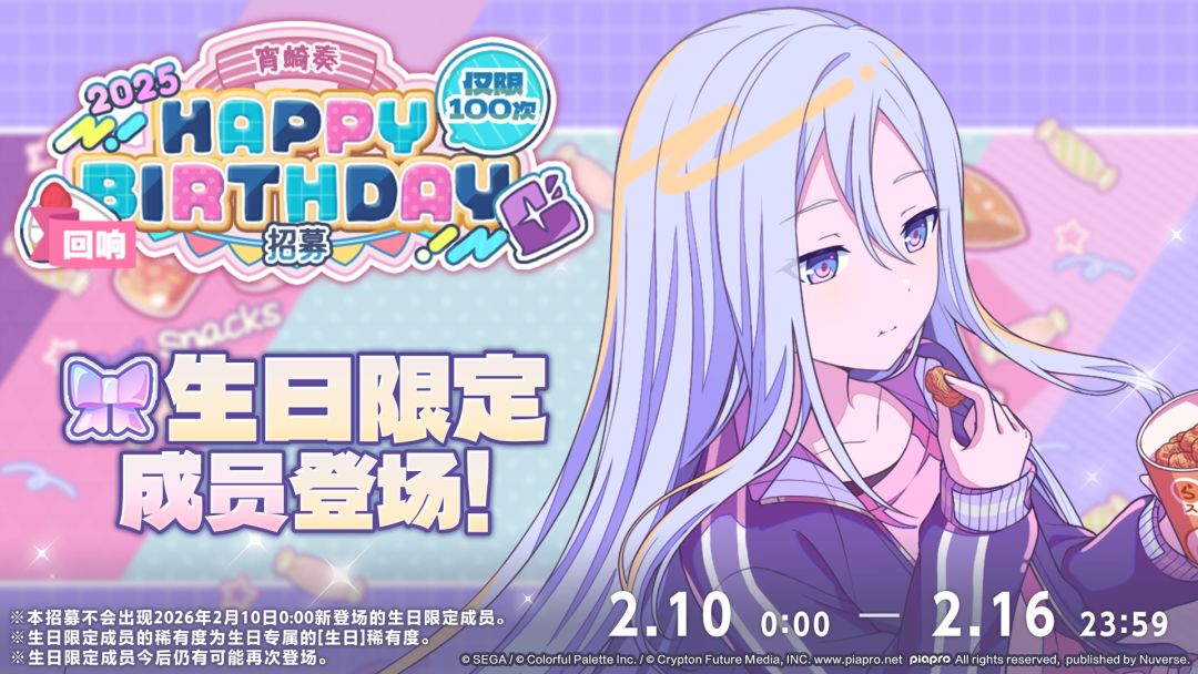 2/10 00:00起将举办「[宵崎奏] HAPPY BIRTHDAY 2026招募」、「[回响][宵崎奏] HAPPY BIRTHDAY 2025招募」、「[回响][宵崎奏] HAPPY BIRTHDAY Stamp招募」、「[回响][宵崎奏] HAPPY BIRTHDAY Flower招募」🎉