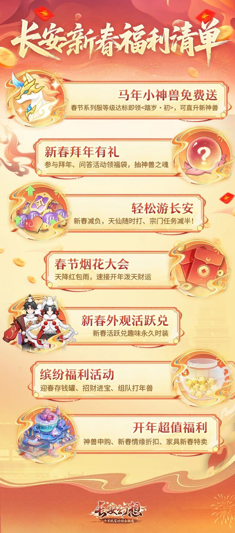 由于篇幅所限,仍有部分马年福利活动未能给御灵师们一一详尽介绍,还请各位在2月13日新春版本到来之日前往长安亲自体验。对于想快速了解长安新春福利的御灵师,猪师兄也备好了一图流“福利清单”。