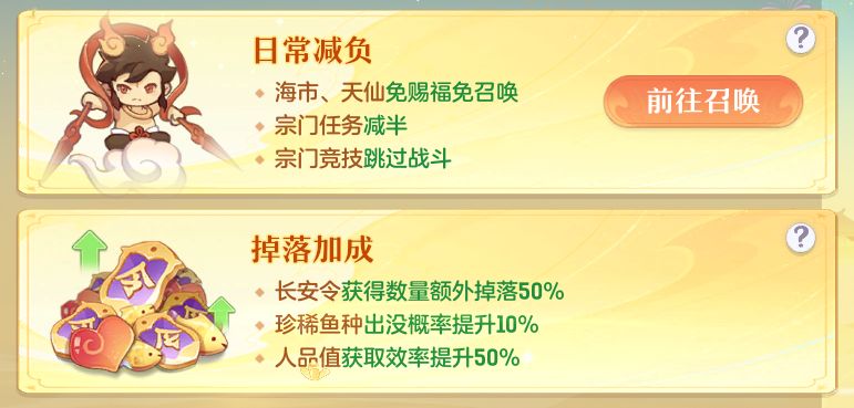 活动期间,御灵师人品值获取效率提升50%;长安令获得数量额外掉落50%;珍稀鱼种出没概率提升10%。