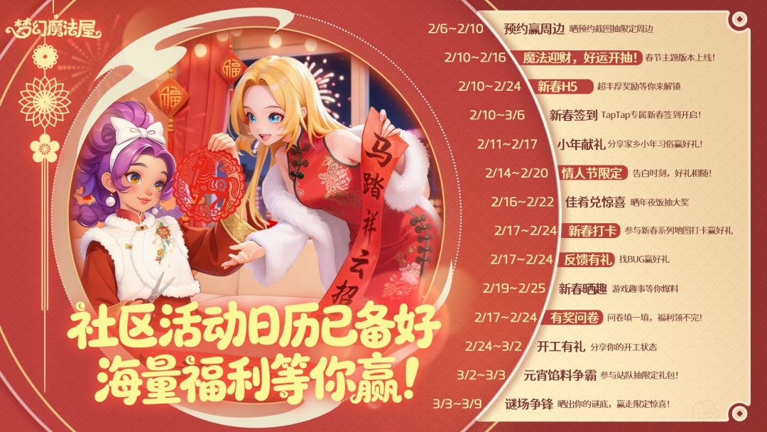 还有更多精彩社区活动,小魔女们戳活动日历查看哦~!有什么关于活动的疑问都可以问帕嘟哦!小魔女们一定要记住新版本上线日期呀🗓!一起来梦幻魔法屋快快乐乐嗨玩新春吧✌!