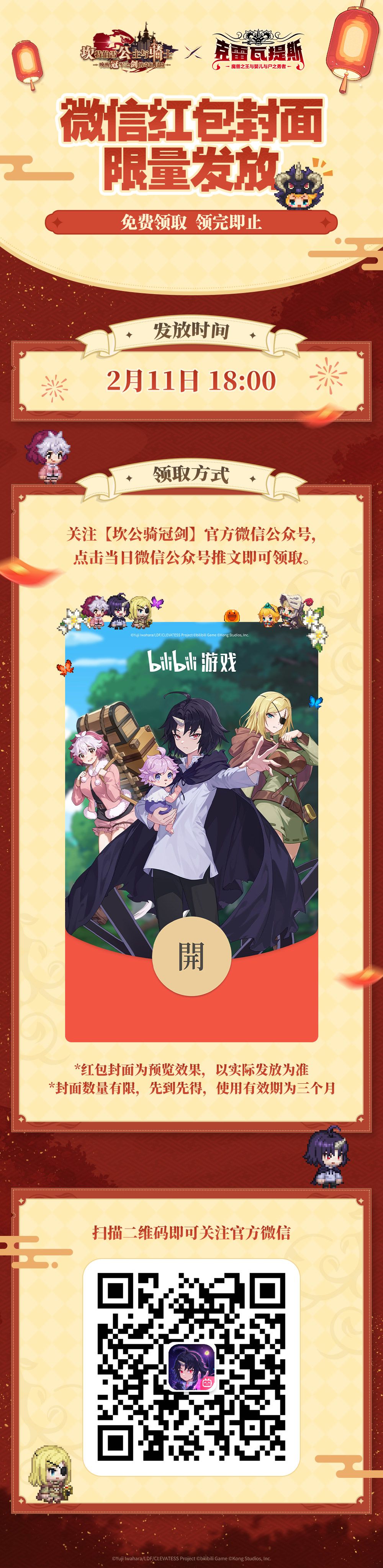 为迎接联动即将开启,小骑士制作了坎公与动画《克雷瓦提斯-魔兽之王与婴儿与尸之勇者-》联动主题的微信红包封面送给大家~祝各位守护者们新春快乐!领取规则详见下图!