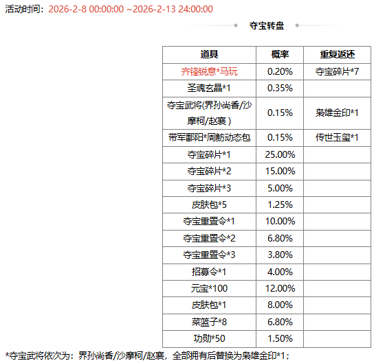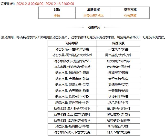 *2026-2-8 00:00:00 ~2026-2-13 24:00:00,齐锋锐意*马玩 70夺宝碎片、带军鄱阳*周鲂动态包 180夺宝碎片 限时上架夺宝商店。2026-2-14 00:00:00 起,齐锋锐意*马玩、带军鄱阳*周鲂动态包 下架。
