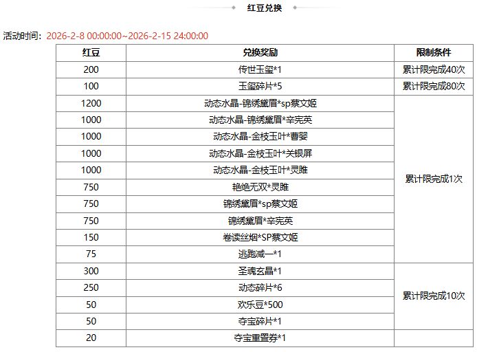 2、红豆 2026-2-16 00:00:00 到期,到期自动删除不回收。传世玉玺未消耗的可用于下期活动;