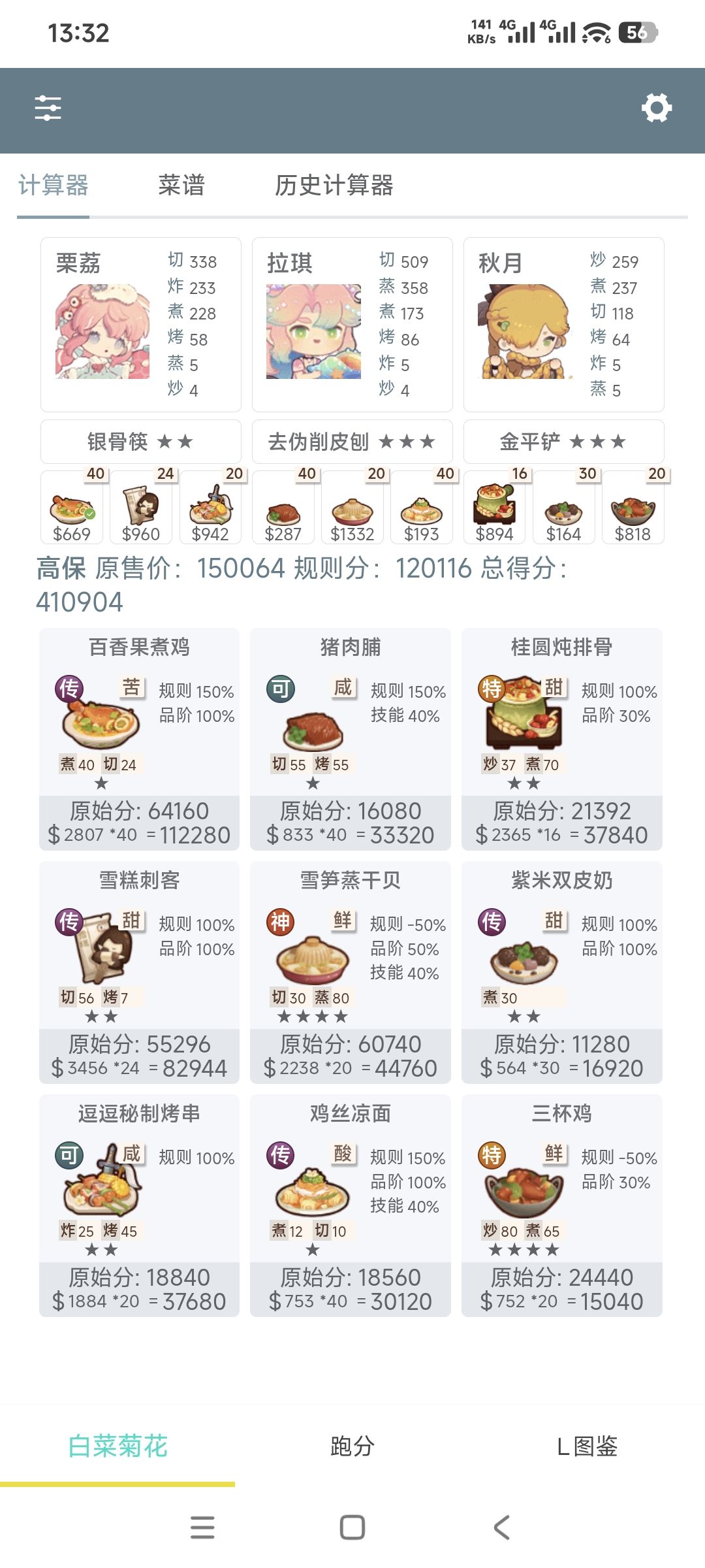 第三张是今天用白菜菊花算的 先上一个菜谱再上厨师 后面再添菜谱,如果没有什么变化就是这样一个分数。后面查了一下距离高保也就差1w分数