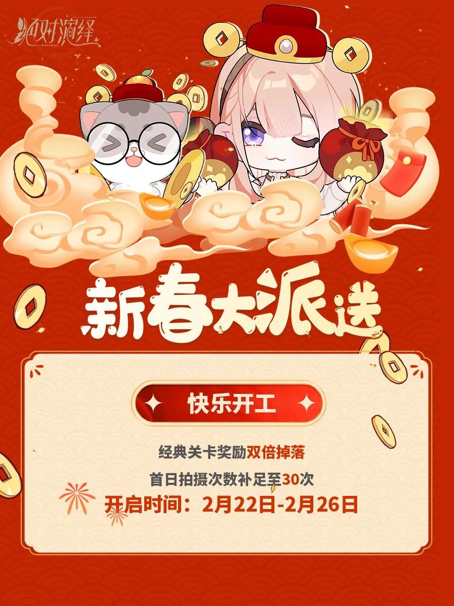同时,同哥也早早准备好了开工福利!2月22日“开工大吉”活动开启,各位艺人成功挑战任意剧本的经典片段,就可以享受双倍加成。春节没有计划?不如和娱记一起来拍摄经典片段,体验精彩剧情,为放假后的开工做热身准备吧!
