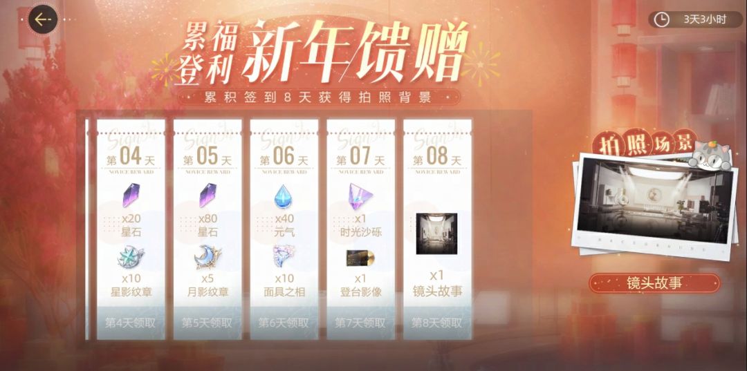 2月22日,新年馈赠签到福利活动开启!累积签到八天即可获得能让艺人们在新年猛猛出片的拍照背景“镜头故事”,还有登台影像、时光沙砾、星石等好礼等艺人们领取!