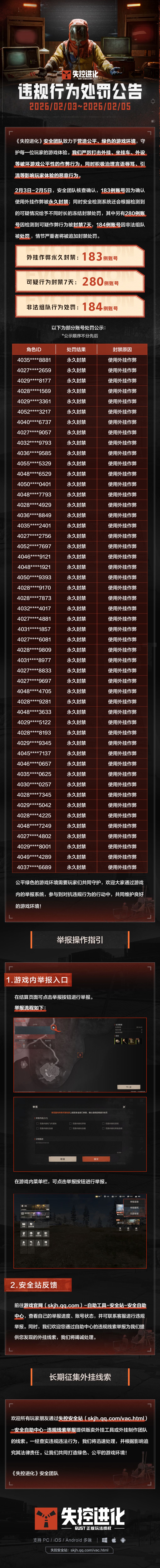 2月3日-2月5日,安全团队核查确认,183个账号因为确认使用外挂作弊被永久封禁;280例账号因检测到可疑作弊行为被封禁7天,184例账号因非法组队被处罚,情节恶劣者将追加封禁。